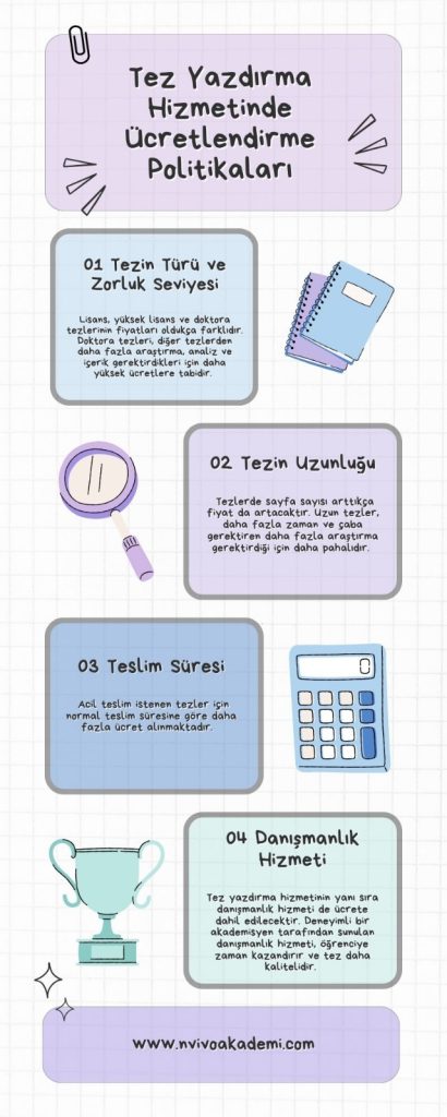 - Ek Hizmetler: Referans listesi hazırlama, bibliyografya düzenleme, grafik ve tablolar oluşturma gibi ek hizmetler ücrete dahil olabilir. Süreç içerisinde öngörülmeyen çalışmalar istenebilir.